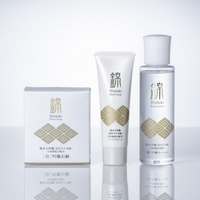 錦 吟醸ローション120ml×1本、錦 吟醸石鹸80g×1個、錦 ハンドクリーム50g×1本