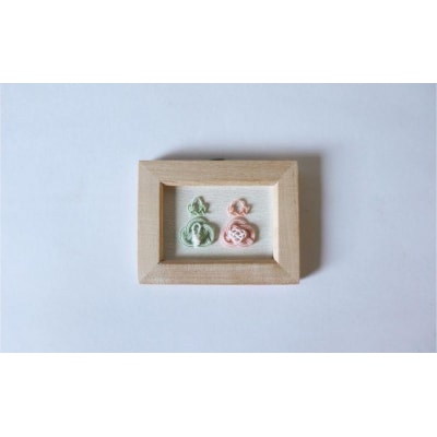 水引のおひなさまを手のりサイズの小さな木のフレームにとじこめました。 水引は美しく存在感のある絹巻き水引を使用しています。 暮らしになじむデザインです。玄関や小窓にそっと飾ってもらえたら。