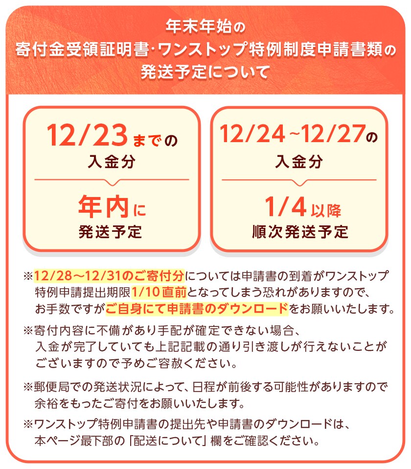 年末年始の寄付金受領証明書・ワンストップ特例制度申請書類の発送予定について