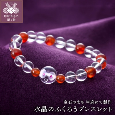 この「水晶のふくろうブレスレット」は甲州水晶貴石細工の伝統工芸士・米長宏之がカットした水晶のふくろうとトップに仕立てた可愛らしい開運アクセサリーです。目には幸運をもたらす宝石とされるルビーを配しました。さらにブレスレットのビーズは赤瑪瑙と水晶を用いました。※この返礼品については、全ての工程を区域内で行っており、その付加価値の割合が5割を超えているため、地場産品基準に適合しています。