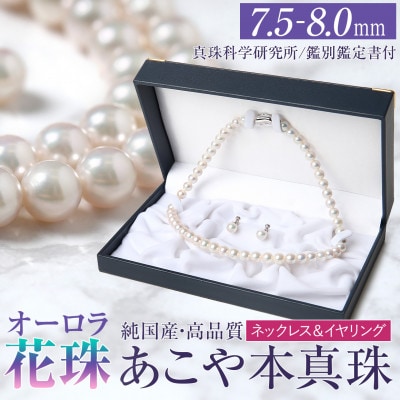 オーロラ花珠 あこや真珠 7.5-8.0mm ネックレス イヤリング セット パール 鑑別鑑定書付