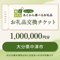 大分県中津市のあとから選べるお礼品【お礼品交換チケット1,000,000円分】が付与されます。付与されたお礼品交換チケットは大分県中津市が指定するお礼品と交換が可能です。