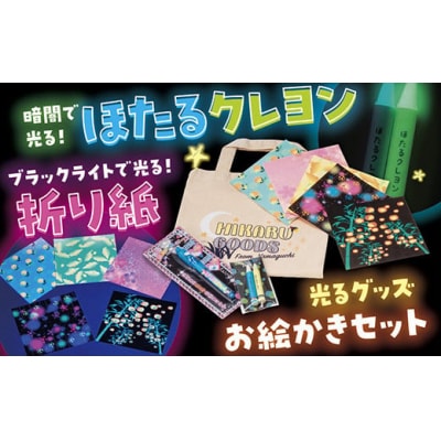 三笠産業が世界で初めて開発した【フルカラーUV/蓄光トナー】を混ぜ込んで作った【ブラックライトで折り紙】【光を蓄積し暗いところで光る「ほたるクレヨン」】のセットです。