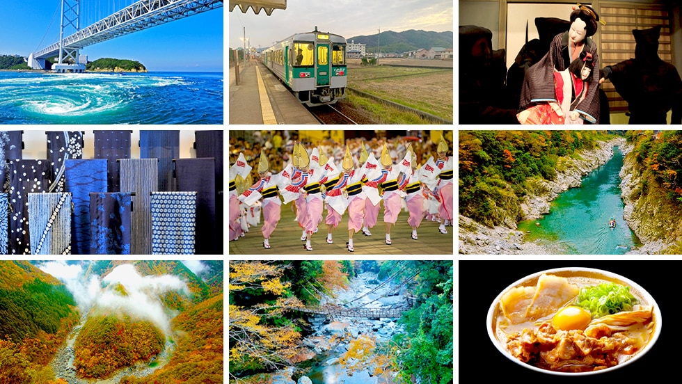 日本人の心の色「阿波藍」、情緒溢れる「阿波おどり」や「人形浄瑠璃」、大自然の驚異「鳴門の渦潮」、翡翠色の川面が輝く「大歩危小歩危」、秘境「祖谷渓谷」、サンゴ咲く「牟岐大島」。