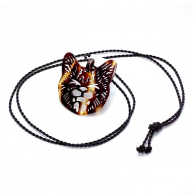 べっ甲そのものが持つ斑模様が毛色を思わせ、透かし彫りで表現した目・鼻・口などのパーツと相まって、猫らしさが溢れる一品となっています。