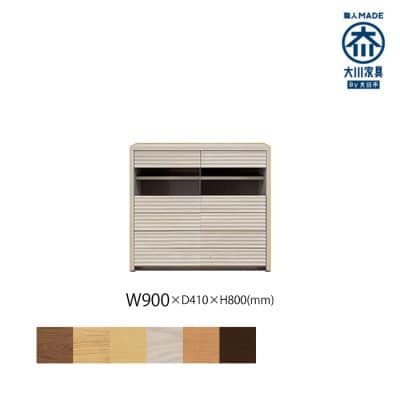 ダイニングキッチンやベッドルームにも調和するシンプルで上品な国産木製リビングボード。家電収納棚あり