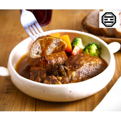 牛肉、豚肉、玉ねぎ、牛乳、パン粉、卵、片栗粉、にんにく、食塩、コショウ、グルタミン酸ナトリウム、ナツメグ、脱脂加工大豆、小麦、アルコール、調味料(アミノ酸等)、はちみつ、砂糖、りんご果汁、カラメル色素
