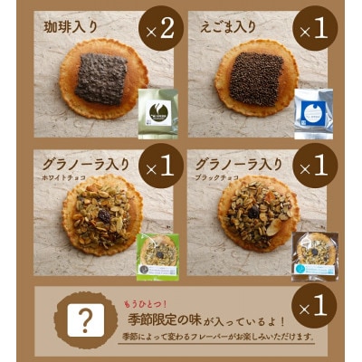 味噌煎餅(2枚×3袋)、生しょうが入り(2枚×3袋)、珈琲入り(2枚×2袋)、えごま入り(1枚×1袋)、酒かす入り(2枚×1袋)、緑茶玄米入り(1枚×1袋)、野草グラノーラ入り(ブラック:1枚×1袋、ホワイト:1枚×1袋)+季節の味(1枚×1袋)