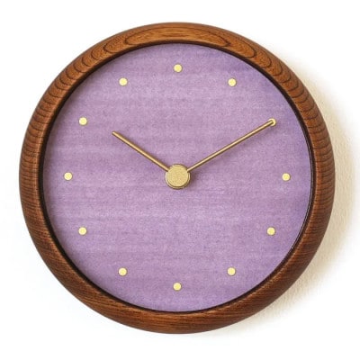 柔らかな形の木の質感と、天然石を砕いた岩絵具の色彩が融合した、色を愉しむオブジェのような置時計です。