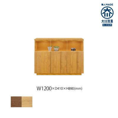 ダイニングキッチンやベッドルームにも調和するモダンな国産木製ルーバーリビングボード。家電収納棚あり。