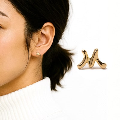 18Kゴールドの上質な輝きと、丸みを帯びた立体デザインが特徴。カジュアルからフォーマルまで、シーンを選ばず装いに洗練を加えます。