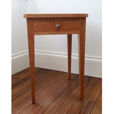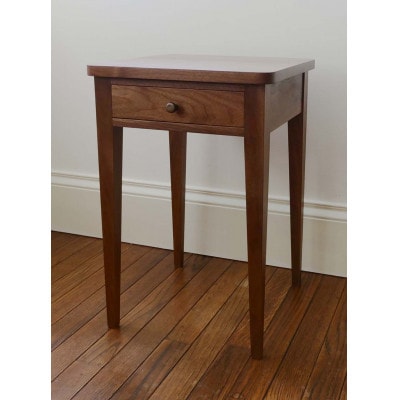 明るい色のメープル無垢材を贅沢に使ったサイドテーブルです。天板の角を少し丸くして、クラシックながらソフトでモダンな印象に仕上げました。引き出しは金物を使わず、伝統的な蟻組で制作しています。引き出し内部は生地張りです。取っ手はアメリカから輸入したニッケルのノブを使用しました。塗装は着色無しで、水に強いセラミックウレタン塗装です。小ぶりに作ってあるので、狭いところにも置けると思います。ベッドサイドや玄関などに良いと思います。