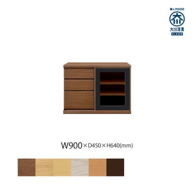 ダイニングキッチンやベッドルームにも調和するシンプルで上品な国産木製リビングボード。家電収納棚あり