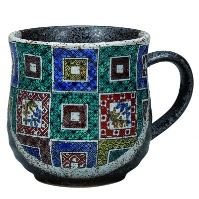 今から350年前に作られた古九谷。草、花、鳥など大胆な模様を描いてます。これらを用いた網付きポットと湯呑 大小のセットです。化粧箱入り。