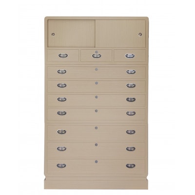 春日部の桐箪笥の起源は、日光東照宮の造営に携わった宮大工が春日部に定住したのが始まりと言われている。その技術を受け継ぎ質実剛健の気風と丈夫で長持ちの春日部桐箪笥です。この箪笥は伝統的工芸品指定商品です。国産桐の上質な桐材を使用致しました。