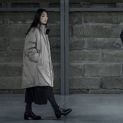 表地にダウンシームがないため、ジャケットスタイルにもあわせやすいソリッドなデザインです。