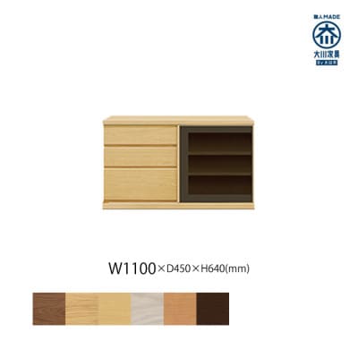 ダイニングキッチンやベッドルームにも調和するシンプルで上品な国産木製リビングボード。家電収納棚あり