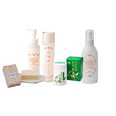 クレンジング、洗顔、馬油、化粧水、クリームの5点セットです。お肌の乾燥が特に気になる方、冬のお肌にオススメのしっとりタイプです。