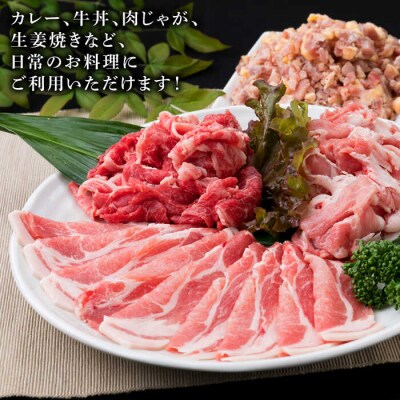 ■牛豚鶏の詰め合わせ!カレー、牛丼、肉じゃが、生姜焼きなど日常の食卓に利用しやすい食材をお届けいたします。