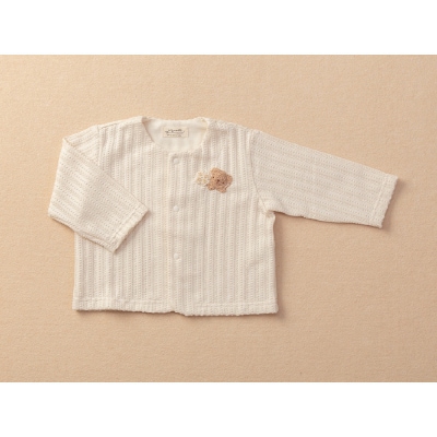 ひとつひとつていねいに編まれたモチーフがついたロンパースはやわらかいガーゼ素材で室内着として大変重宝