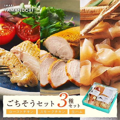 本来の素材の良さを活かすため、保存料や化学調味料を一切使用せず、岩塩やハーブなどシンプルな材料で仕上げたこだわりのローストチキン、スモークチキン、佐賀県伊万里で昔から受け継がれてきた味を再現したおやまのとりめし、しっとり鶏生ハムを詰め合わせました。