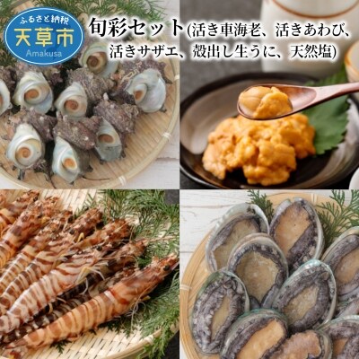 【指定日必須】旬彩セット(活車海老 活きあわび 活きサザエ 殻出し生うに 天然塩)_S002-005