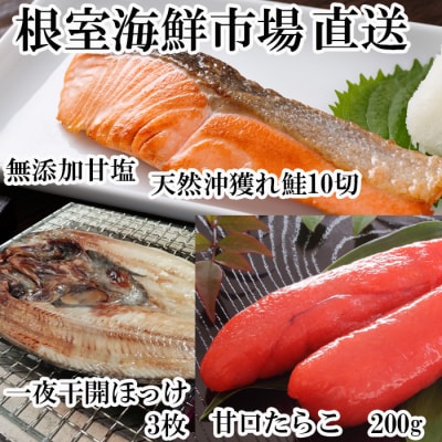 沖獲れ鮭10切、甘口たらこ200g、一夜干し開きホッケ3枚 A-14065