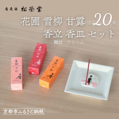 【香老舗 松栄堂】お香スティック(花圃/雪柳/甘露各20本)/香立舞妓/香皿クリーム セット