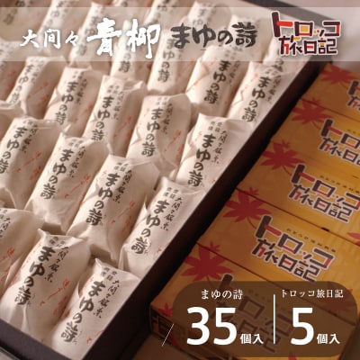 ふるさとの養蚕「繭」をかたどった「まゆの詩」と、かわいい列車の小箱に入れた、さつま芋入りの和風カップケーキ「トロッコ旅日記」のセットです。