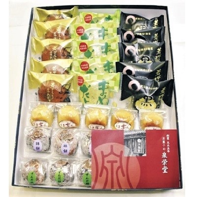 「若返りまんじゅう」は、甘さをおさえた皮むきあんと上品な甘さの黒砂糖と上質の葛を使用したしっとりとした饅頭です。また、皮に竹炭を使用し、中を胡麻あんにした「黒いべ」、あんの中に枝豆のつぶつぶを入れた「まめだよ」、干柿の中に餅入りのつぶあんを入れた「柿餅」、ずんだあんで餅を包み干柿の中に入れた「ずんだ柿」、表面をこんがり焼きあげたスイートポテトの「うま芋ん」をセットにしてお届けします。