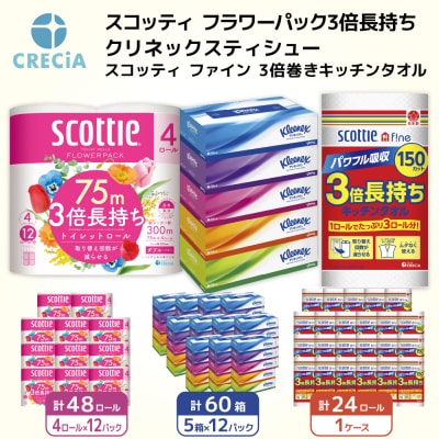 【3品別配送】トイレットペーパー(48ロール)&ティッシュ(60箱)&キッチンタオル(24ロール)
