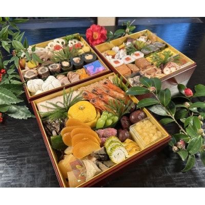 23謹製おせち 三段重(3名様用)【12月31日冷蔵でお届け】 [遊亀楼魚兵]【100S004】