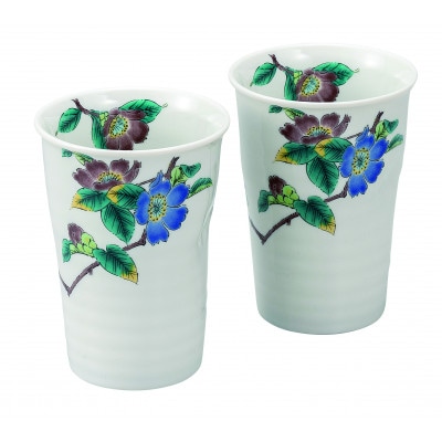 九谷焼独特の青や緑色が白地に映え、内側の山茶花もアクセントになっています。