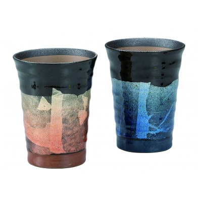 銀箔を貼り付けた上に作者独自の色(ブルーとレッドピンク)を塗り上げ、上品な輝きをしたペアマグカップ