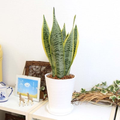 サンスベリア 5号 ホワイトスクエアプラスチック鉢 土の表面:ウッドチップ