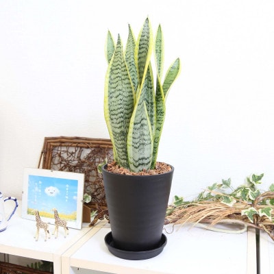 サンスベリア 5号 ブラック丸プラスチック鉢 土の表面:ウッドチップ