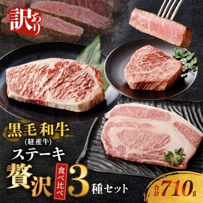 15【訳あり】黒毛和牛 ステーキ 贅沢3種食べ比べセット(合計710g)【T025-0145】(都農町)