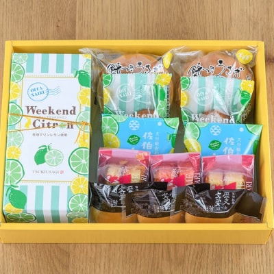 佐伯の食材を使用したお菓子の詰め合わせ(ウィークエンドシトロン、佐伯マリンレモン、菊姫物語、歴史と文学の道、餅つきうさぎ) 豊かな自然に恵まれた佐伯の食材をご堪能下さい。