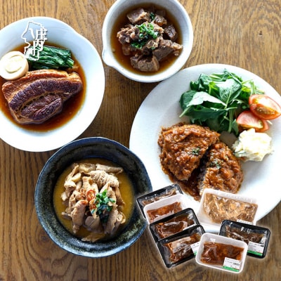 庄内豚を手軽に味わうことができる、国産牛・三味豚すじ煮込み、豚バラ角煮、モツ煮込み、手作りハンバーグのセット。