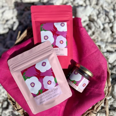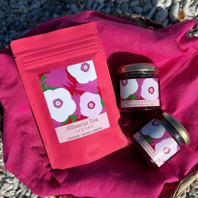 座間味村産ハイビスカスを使った2種類のハーブティーと、ハイビスカスジャムの飲み比べ・味わいセット。