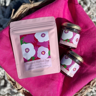 座間味村産ハイビスカスを使用したハーブティーと、村内で手作りしたハイビスカスジャムのセット。