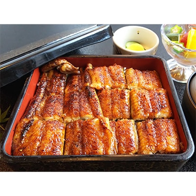 三河産の大きな鰻半尾を特製のたれで焼き上げた、うなぎ重のセット。肉厚鰻の旨味をお楽しみ下さいませ。