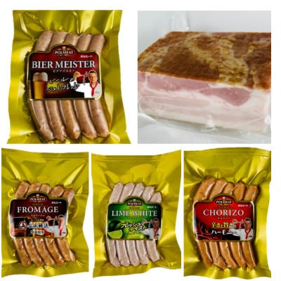 ポルミートのこだわりソーセージ4点とベーコンブロックのセットです!