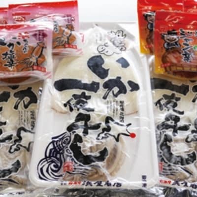 はちみつを入れて熟成させたいか塩辛、唐辛子とたれで漬け込んだいかジャン辛、いか一夜干しの3品セットです。