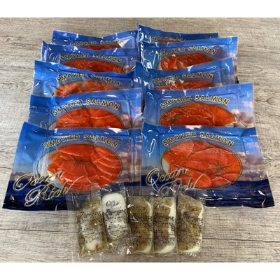 ギフト・自宅用ともに大人気の燻製5種セットです!(天然紅鮭・キングサーモン・かんぱち・真鯛・帆立)