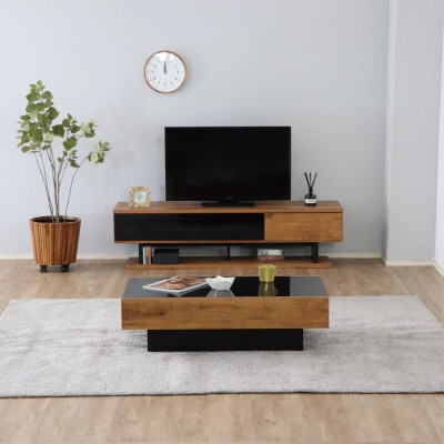 【完成品】ナチュラルベージュのおしゃれなリビングテーブルです。スライド棚にはコレクションなどのディスプレイを楽しめます。