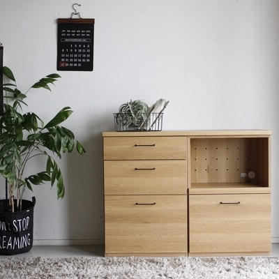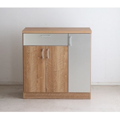 【完成品】やさしい木目のナチュラルベージュとシルバーのコントラストがオシャレなシャビーナチュラル色の収納棚。キッチンはもちろんリビングでも収納カウンターとしてご使用いただけます。