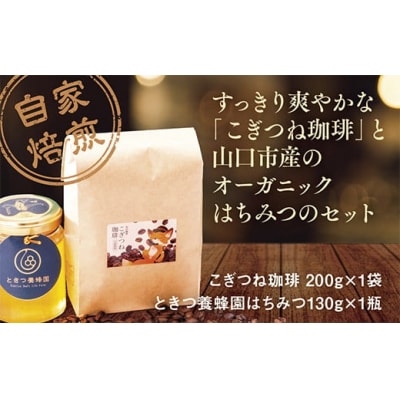 山口市湯田温泉の焙煎所で自家焙煎したオリジナルブレンド「こぎつね珈琲」と「ときつ養蜂園」のはちみつをセットにしました。