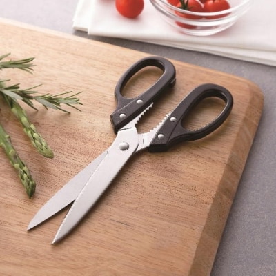 硬いカニの足なども簡単に切れる、ギザ刃付きのキッチンバサミです。