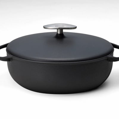 高い熱伝導性や保温性から、プロの料理人が好んで使用する鋳物ホーロー鍋。 UNILLOY ユニロイ 浅型 キャセロール ホーロー鍋 鍋 両手 24cm 藍 燕三条製